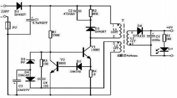 市電經(jīng)D1整流及C1濾波后得到約300V的直流電壓加在變壓器的①腳(L1的上端),同時(shí)此電壓經(jīng)R1給V1加上偏置后后使其微微導(dǎo)通,有電流流過L1,同時(shí)反饋線圈L2的上端(變壓器的③腳)形成正電壓,此電壓經(jīng)C4、R3反饋給V1,使其更導(dǎo)通,乃至飽和,最后隨反饋電流的減小,V1迅速退出飽和并截止,如此循環(huán)形成振蕩,在次級(jí)線圈L3上感應(yīng)出所需的輸出電壓。L2是反饋線圈,同時(shí)也與D4、D3、C3一起組成穩(wěn)壓電路。當(dāng)線圈L3經(jīng)D6整流后在C5上的電壓升高后,同時(shí)也表現(xiàn)為L2經(jīng)D4整流后在C3負(fù)極上的電壓更低,當(dāng)?shù)椭良s為穩(wěn)壓管D3(9V)的穩(wěn)壓值時(shí)D3導(dǎo)通,使V1有基極短路到地,關(guān)斷V1,最終使輸出電壓降低。電路中R4、D5、V2組成過流保護(hù)電路。當(dāng)某些原因引起V1的工作電流大太時(shí),R4上產(chǎn)生的電壓互感器經(jīng)D5加至V2基極,V2導(dǎo)通,V1基極電壓下降,使V1電流減小。D3的穩(wěn)壓值理論為9V+0.5~0.7V,在實(shí)際應(yīng)用時(shí),若要改變輸出電壓,只要更換不同穩(wěn)壓值的D3即可,穩(wěn)壓值越小,輸出電壓越低,反之則越高。